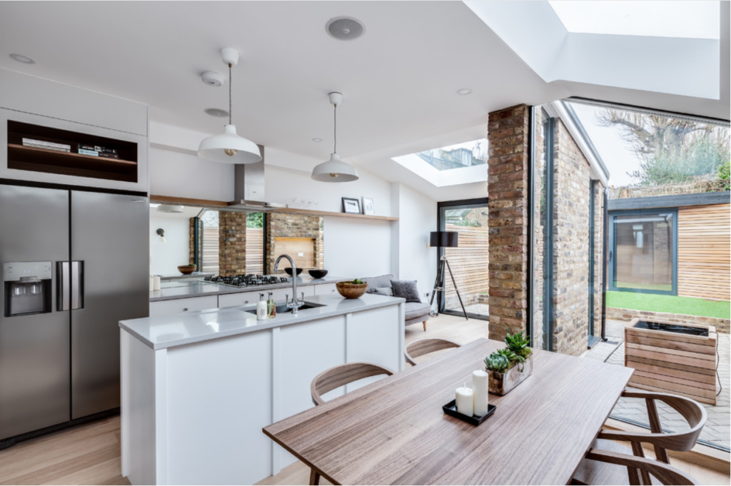 This mirrored splashback reflects the garden, creating the illusion of more outdoor space, as well as visually doubling the presence of the feature brick wall. This light- and the space-boosting effect is heightened by combining the mirror with the glass ceiling and large windows.